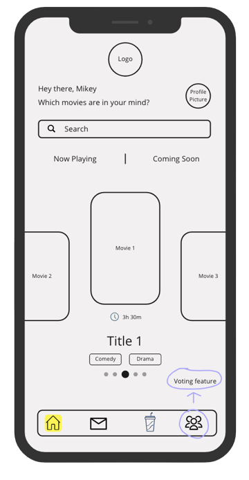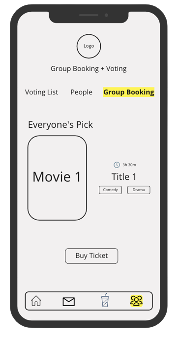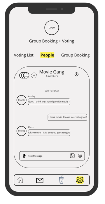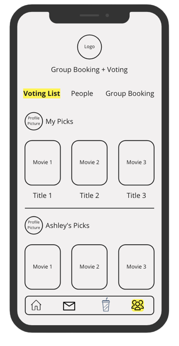 To improve booking, I aim to enhance the movie theater app with a better way for groups to choose movies together. Each group member can select movies they want, and the group can decide using app features, avoiding long text threads seen with current methods.